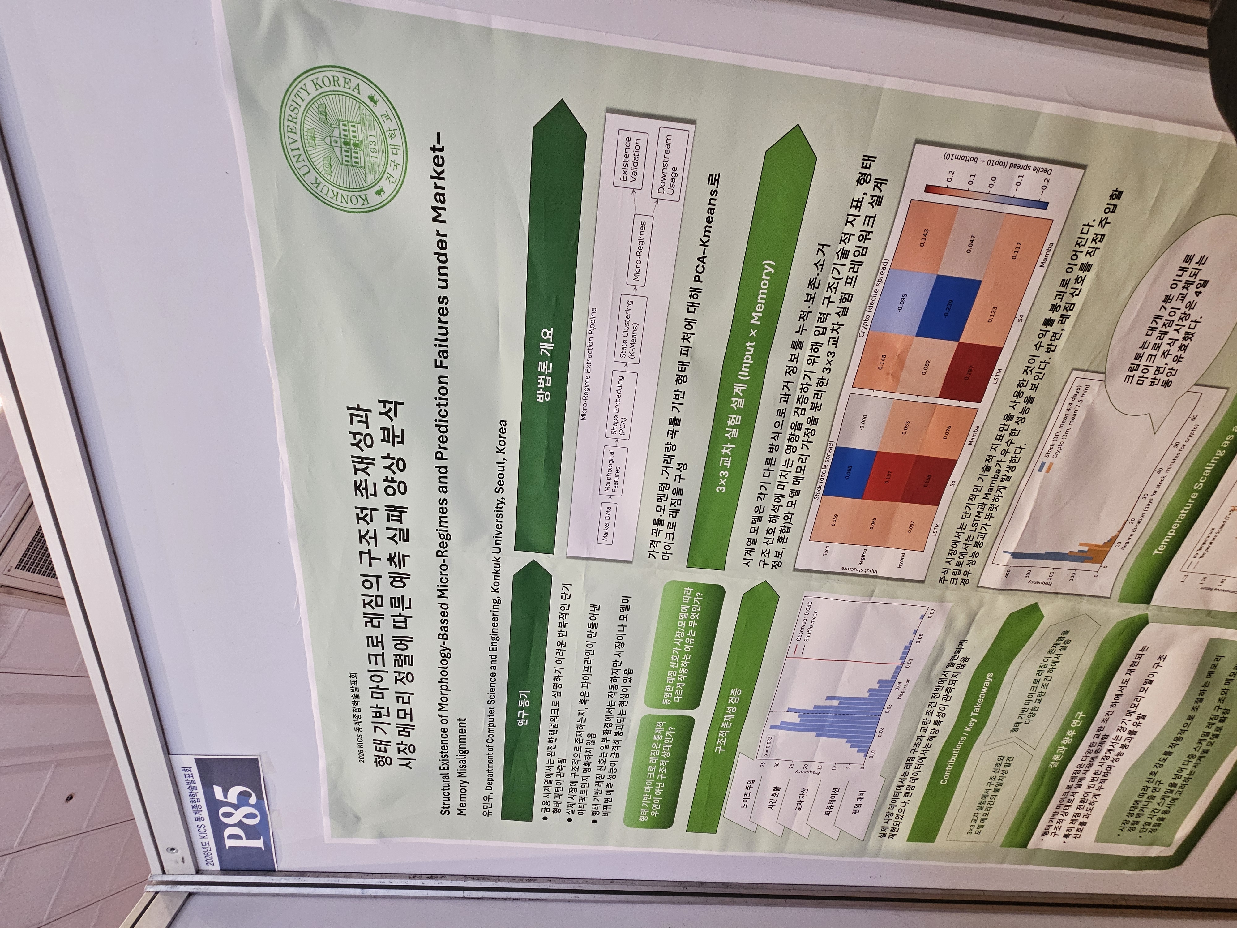 이것이 아티팩트가 아님을 보여주기 위해서 7가지 강건성 실험과 3가지 서로 다른 시장(외환, 주식, 코인)에 대해서도 교차 검증했습니다. 아티팩트가 아닌 것으로 최종적으로 추정되자 모델 메모리 특징에 따라서 성능 차이와 시장별 마이크로 레짐의 지속성에 대해 깊이 탐구하기 위해서 입력 구조와 모델 이렇게 3x3 실험을 주식, 코인 시장에 대해 진행했습니다. 경제적으로 유의한 결과가 나오는 모델의 종류가 시장 별로 달랐던 점이 놀라웠습니다.